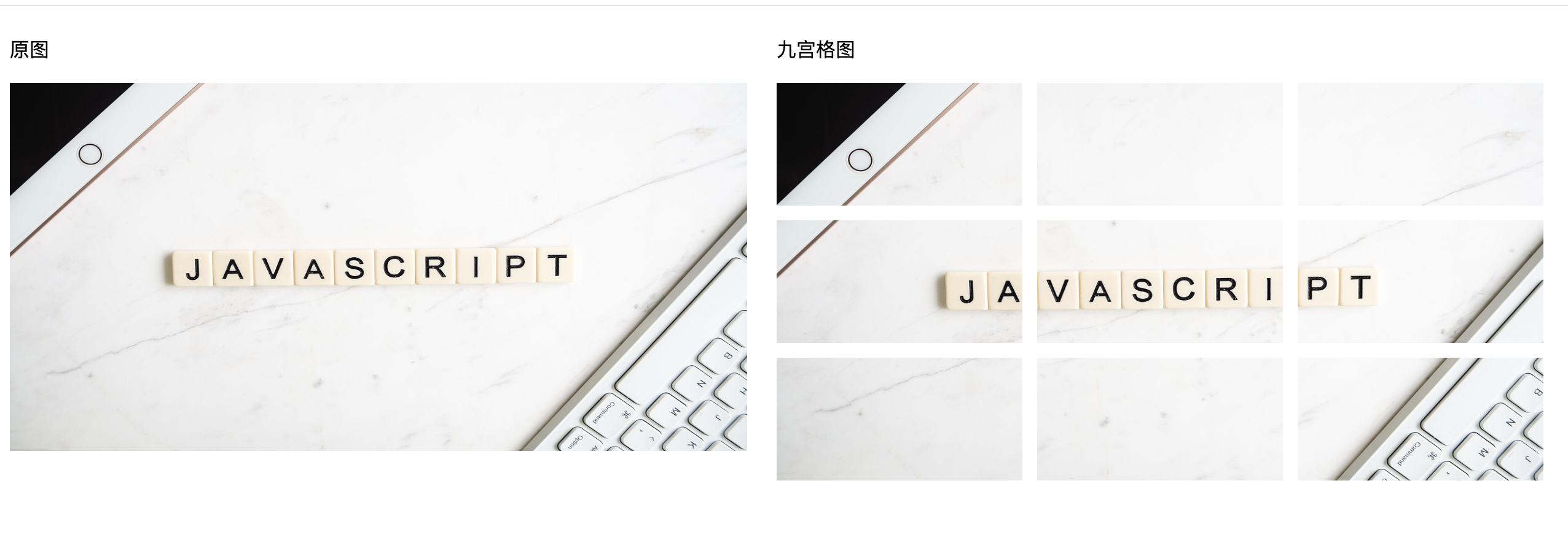 为了让九宫格中的 9 个小块拼起来,正好能完整覆盖原图,那么每个小块在视觉上是整张图的 1/3 宽 × 1/3 高。