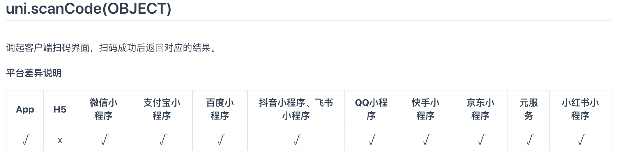 在uni-app的Api文档中显示,uni.scanCode扫码方法在H5端是不支持的,所以我们需要自己开发一个扫码组件。